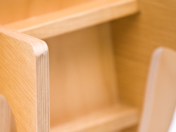 Tendo Mokko makes its furniture using thin layers of wood that are layered together and formed by putting them into a press and adding pressure and heat, and we have developed a new type of compaction technology that requires less heat and shorter time in the press so that the wood can be formed into just the right thickness. This new technique leaves a clean wood grain that looks good and is easy to process.